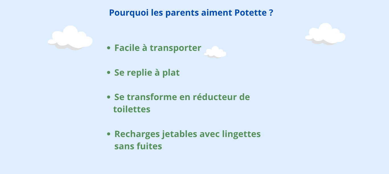 Le fait d'avoir le pot Potette Plus à portée de mains permet de parer à toutes "les urgences" lorsque vous et votre enfant êtes en vadrouille !